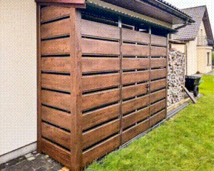 Wiata śmietnikowa Schowek – 3×0,8m – zabudowana panelami – Drzwi – Ciemny orzech – drewnopodobny – dach spad w przód TKD282