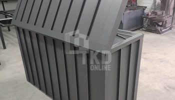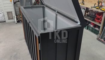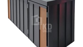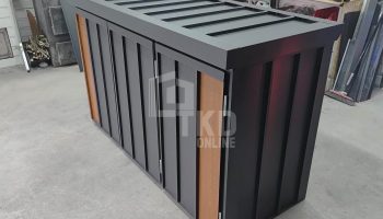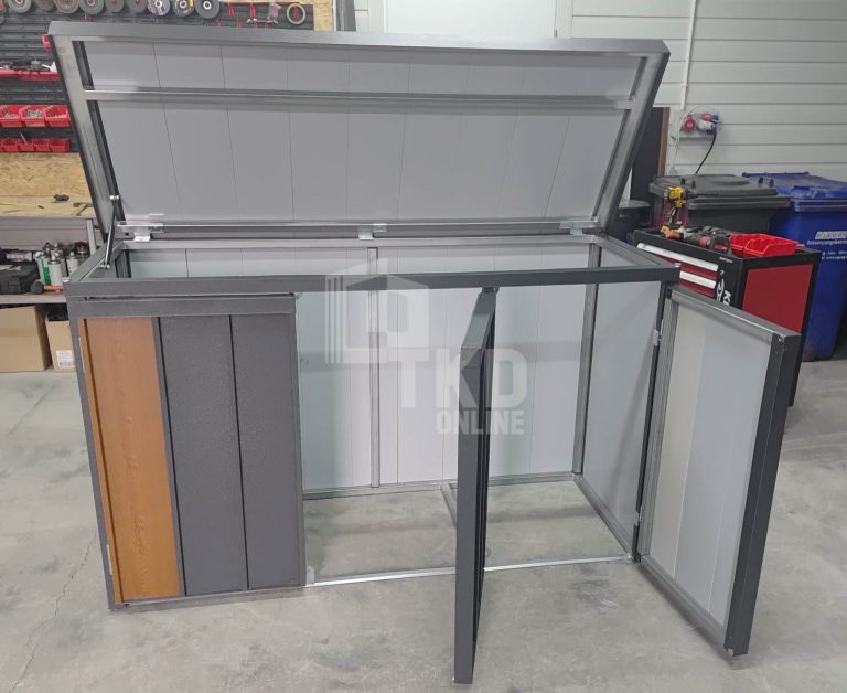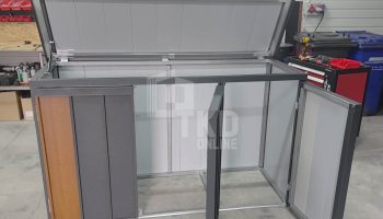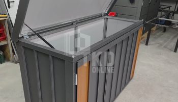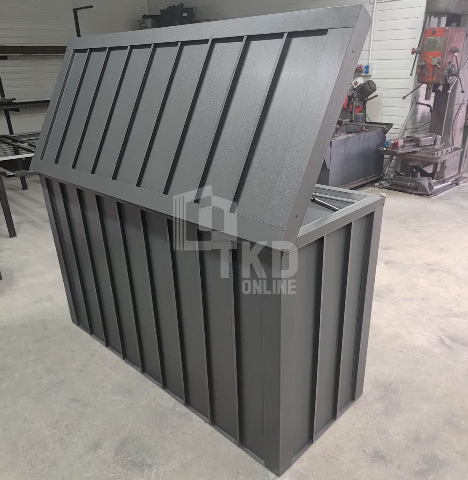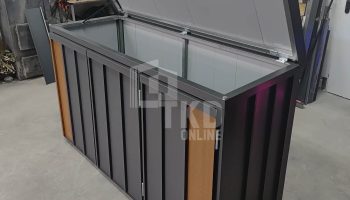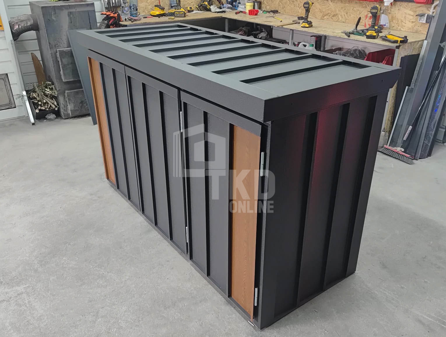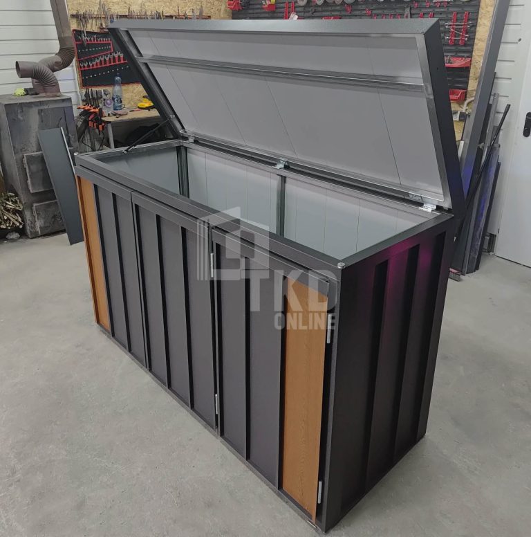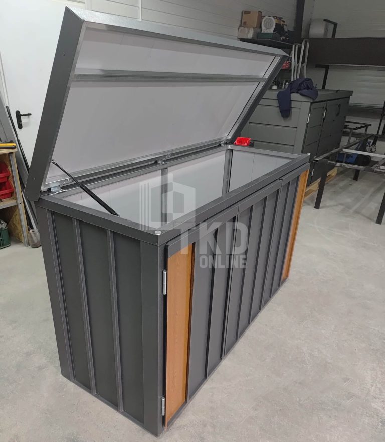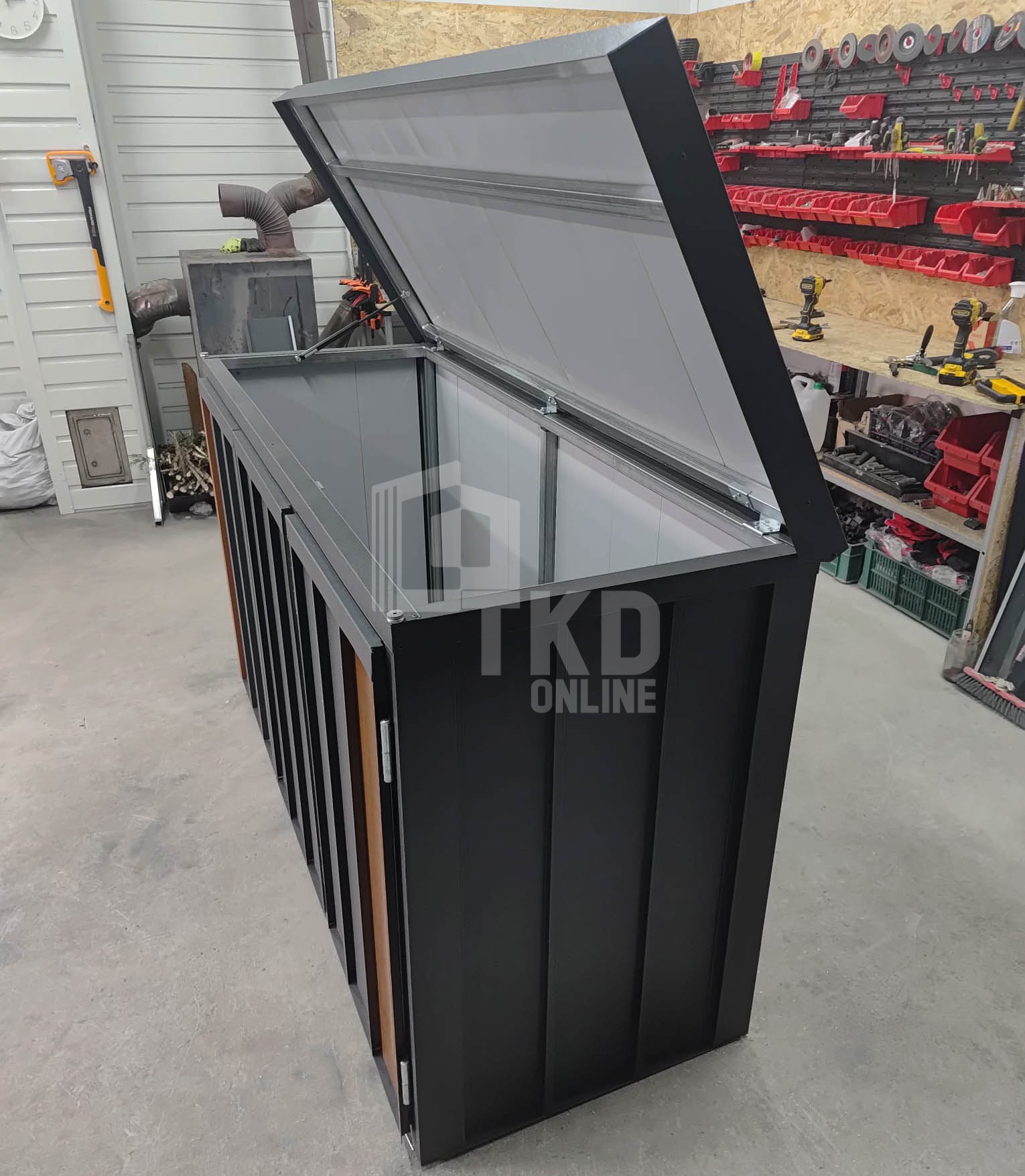 • szerokość: 177 cm • głębokość: 65 cm • wysokość: 110 cm • pojemność: 3×120 L • kolor klapy: ciemny grafit – antracyt mat BTX 7016 • kolor ścianek: ciemny grafit – antracyt mat BTX 7016 + jasny orzech • obróbki ścianek kolor ciemny grafit – antracyt mat BTX 7016 • obróbki klapy ciemny grafit – antracyt mat BTX 7016 • 3x drzwiczki z magnesem • 1x klapa górna z siłownik wstrzymujący • konstrukcja – profil zamknięty ocynkowany 30×30 • próg wykonany z płaskownika • nity + wkręty w kolorze osłony
