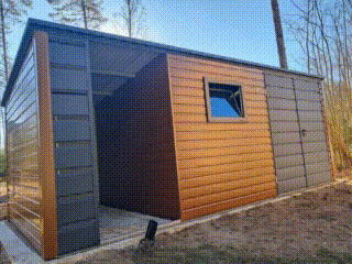 • szerokość : 4,5 m • długość : 2 m • wiata : 2×2 m zabudowana blachą i panelami kolor: jasny orzech + antracyt mat • dach : spad w tył kolor : antracyt mat 7016 • brama dwuskrzydłowa 180 x 200 cm przetłoczenie poziom T17 kolor : antracyt mat 7016 • okno uchylne PCV 80x60cm • Przetłoczenie ścian T7 poziom kolor : jasny orzech • wysokość ścian z przodu : 214 cm • wysokość ścian z tyłu : 190 cm • Konstrukcja – profil zamknięty ocynk • Zamek + Klucze • nity + wkręty w kolorze garażu • obróbki ścian i dachu MOŻLIWA EDYCJA PROJEKTU (WYMIARÓW, KOLORU, MATERIAŁU ORAZ INNYCH ELEMENTÓW) PRZY WCZEŚNIEJSZY KONTAKCIE  Opcje dodatkowe: