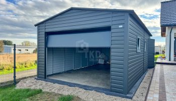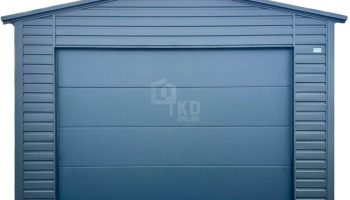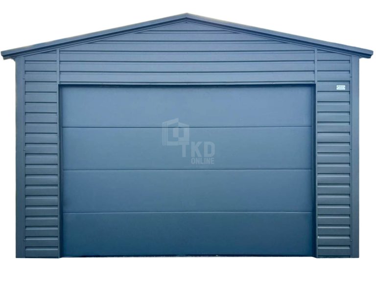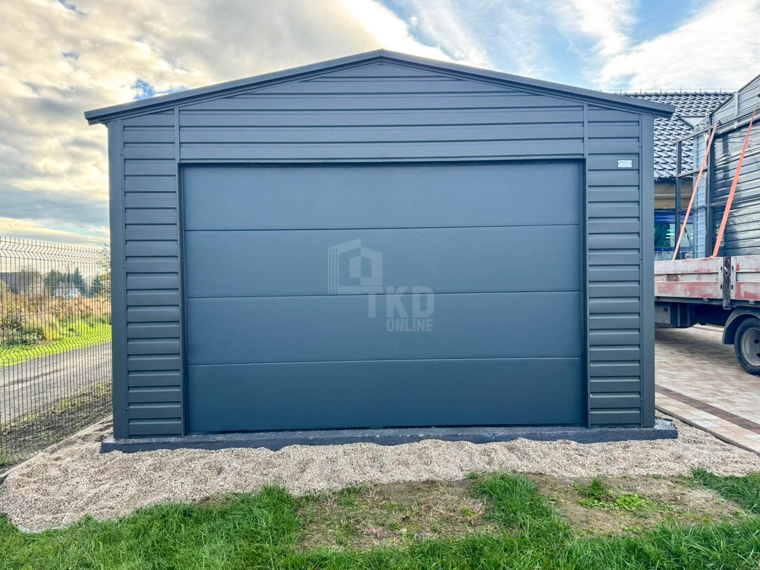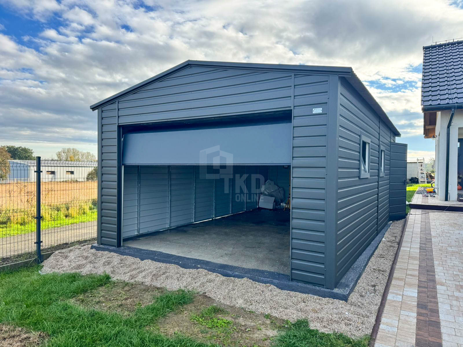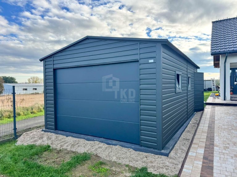 Garaż blaszany 4x6m – brama segmentowa – drzwi – 2 x okno – antracyt – dach duwpadowy TKD419