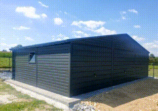 Garaż Blaszany 9×6 – 3x Brama – 2x okno – rynny – Antracyt – dach dwuspadowy TKD104
