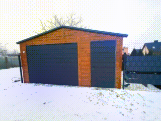 Garaż Blaszany 5×5 Brama – drzwi – 2x okno – jasny orzech + Antracyt – drewnopodobny – dach dwuspadowy TKD90
