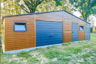 Garaż Blaszany 8,5x6m + Wiata 1,5x6m Brama Uchylna – Drzwi – 3x Okno – jasny orzech – drewnopodobny – Antracyt – Dach dwuspadowy TKD263
