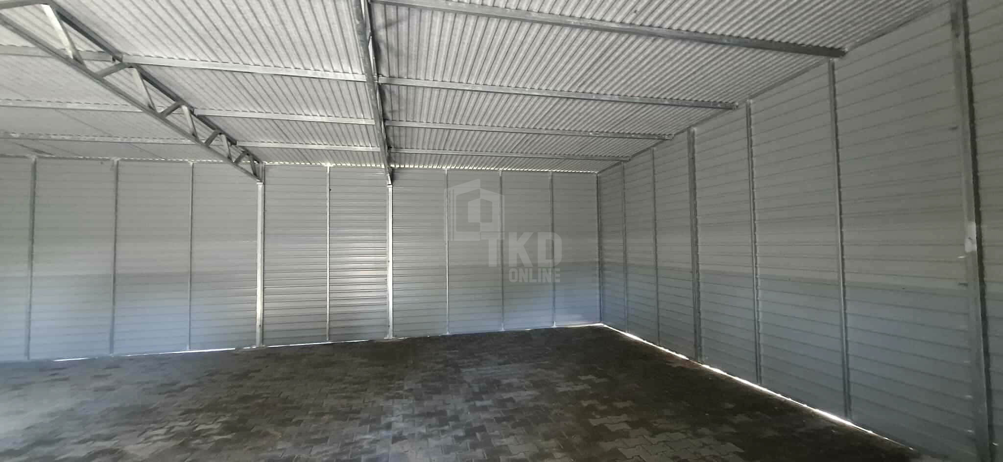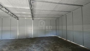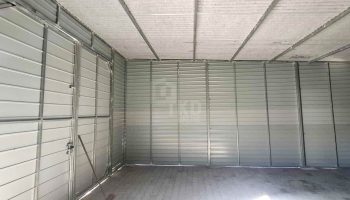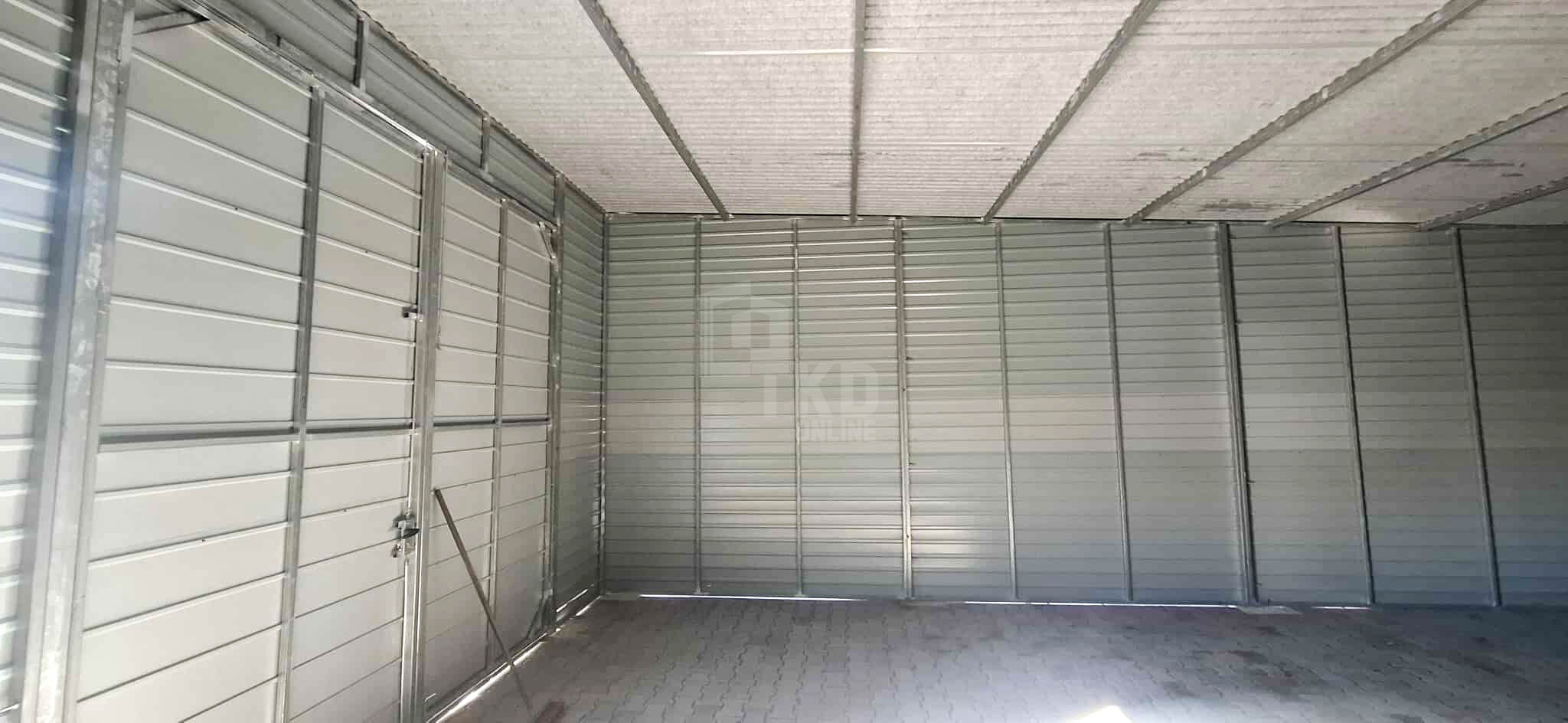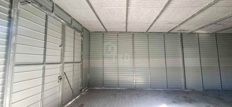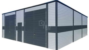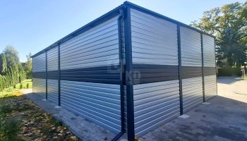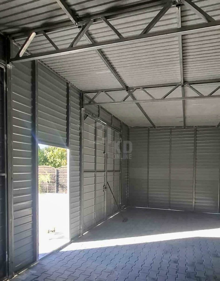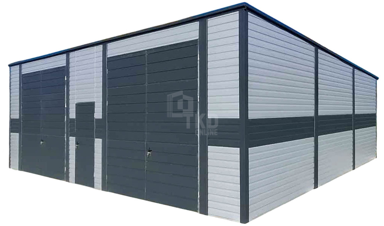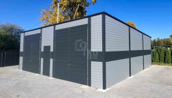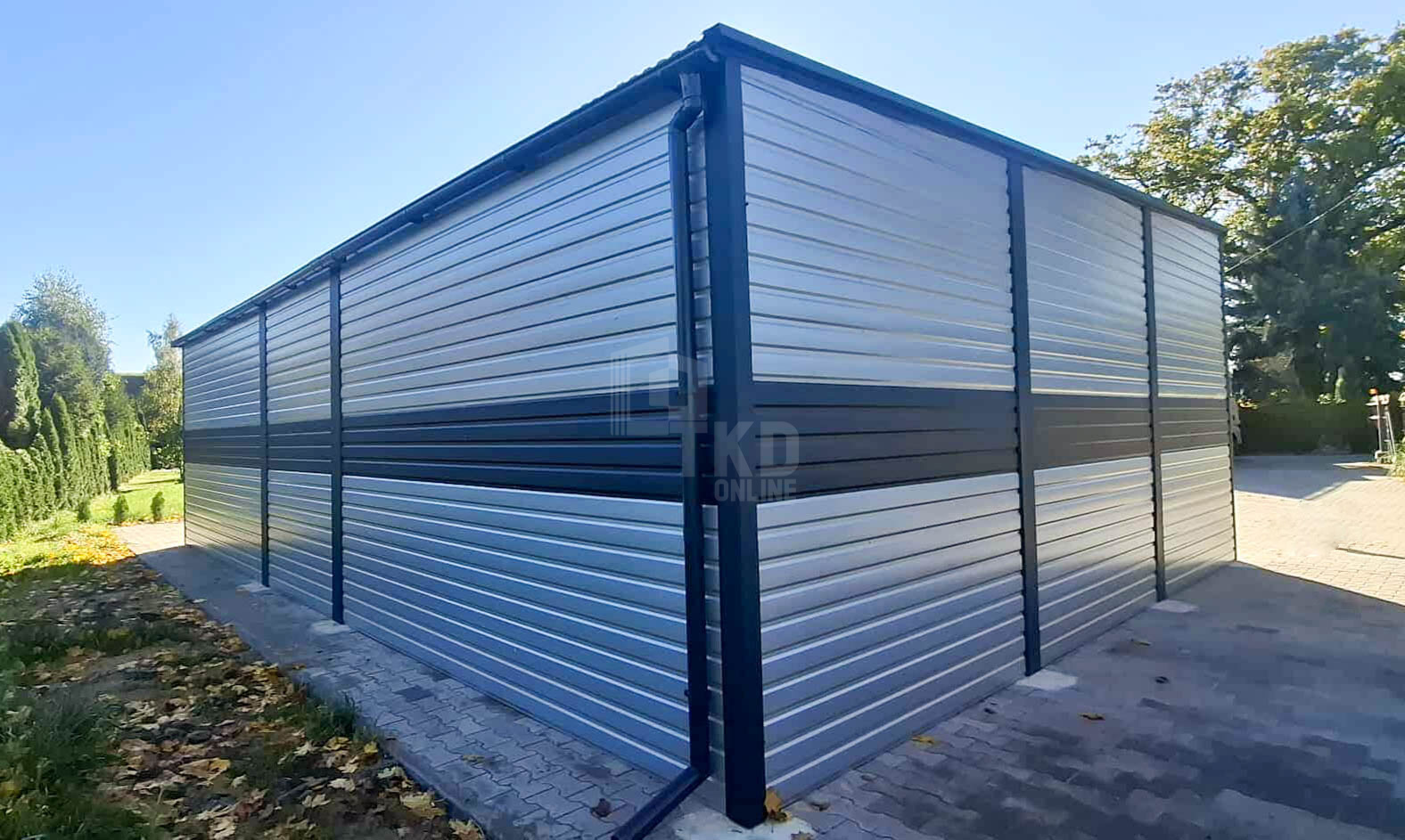 Hala – garaż blaszany 9,5x9m – 2 x brama dwuskrzydłowa – drzwi – jasny srebrny – antracyt – dach spad w tył TKD426